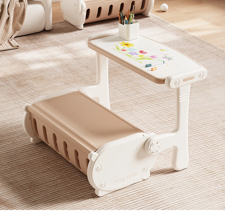 This multifunctional children’s study desk and chair is designed to combine learning, storage, drawing, and play in one unit. The ergonomic height supports healthy posture, reducing pressure on the neck and spine. Rounded edges and a stable structure ensure safety during every use. The large storage compartment underneath keeps books, stationery, and toys neatly organized. Made from safe, eco-friendly materials with no unpleasant odors, and featuring a dust-free blackboard for easy drawing and erasing, it allows kids to unleash their creativity while enjoying a fun and tidy study space.